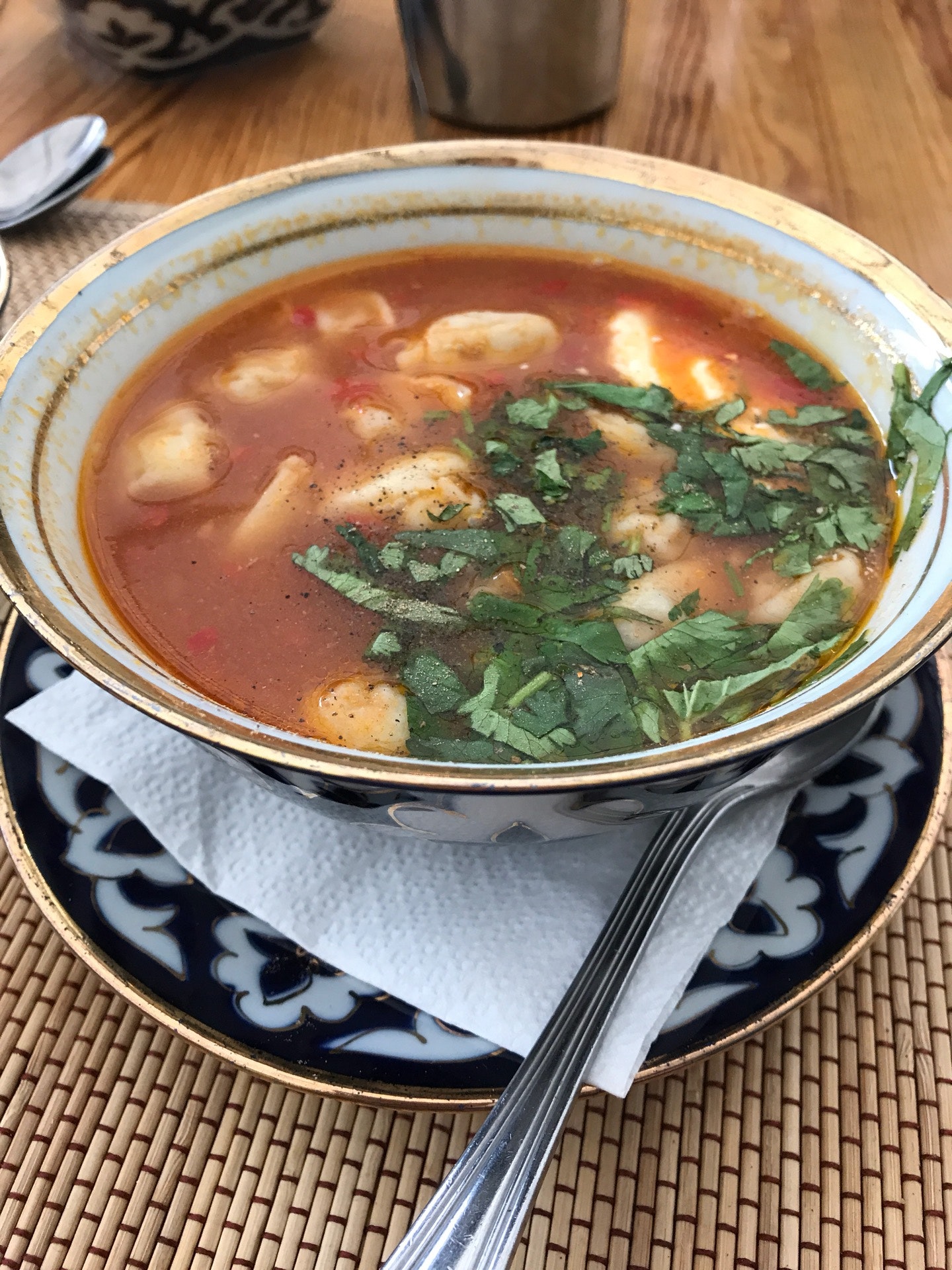Very good Uzbekistan restaurant. Four people ate fully with two bottles of wine and vodka, but it only charges about 200USD. will go back again and recommend my friends