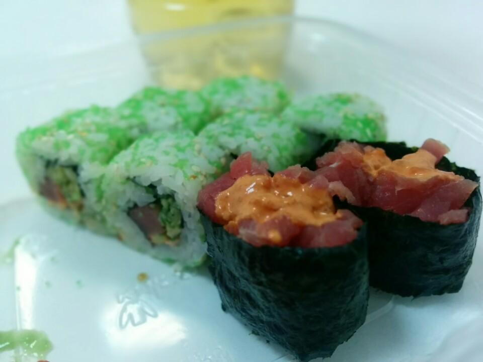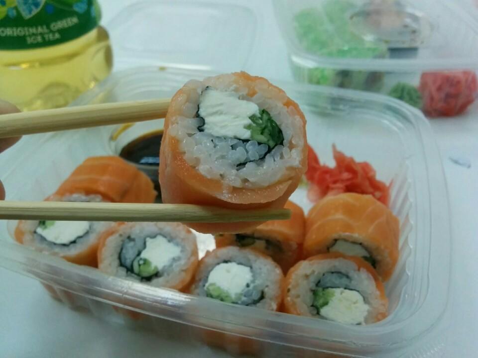 I love the spicy tuna rolls, Philadelphia rolls are also really tasty. Not a great place to sit down, but they deliver to your office for lunch! One of my favorite sushi places in Almaty!